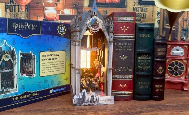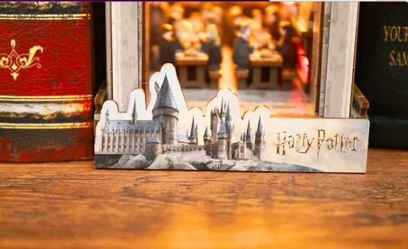 Van studenten verzameld aan de huistafels tot de grote kroonluchters en glas-in-loodramen, deze boekenhoek legt de essentie van Hogwarts vast in miniatuurvorm.