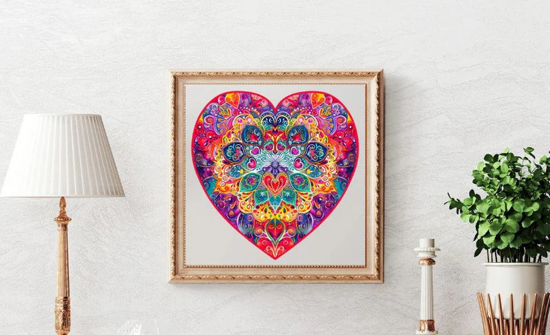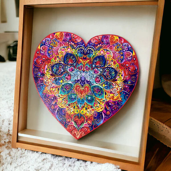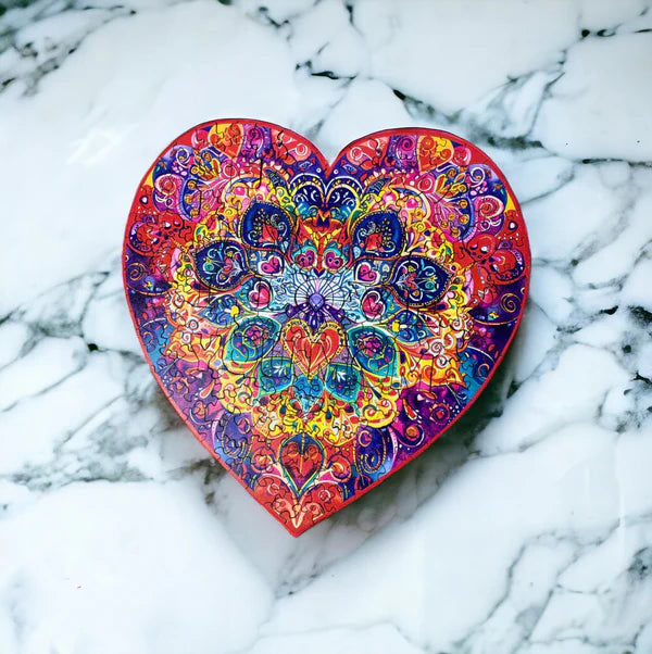 Het puzzelstuk is een betoverende mix van ingewikkeld ontwerp en bewuste montage. Elk stuk past naadloos in het volgende, waardoor een verbluffend mandala-patroon ontstaat dat zowel rustgevend als fascinerend is.