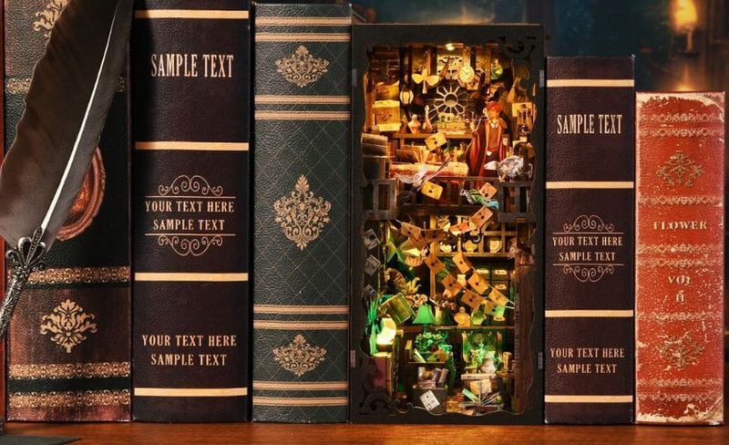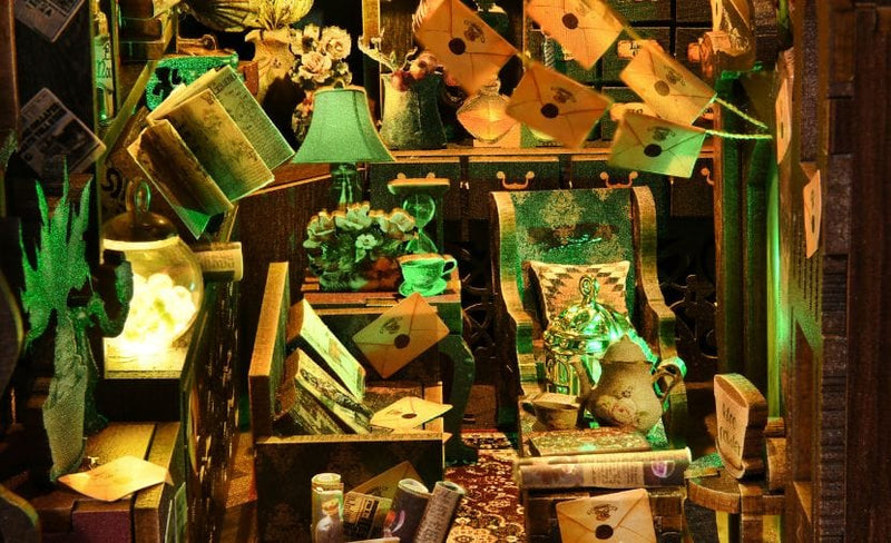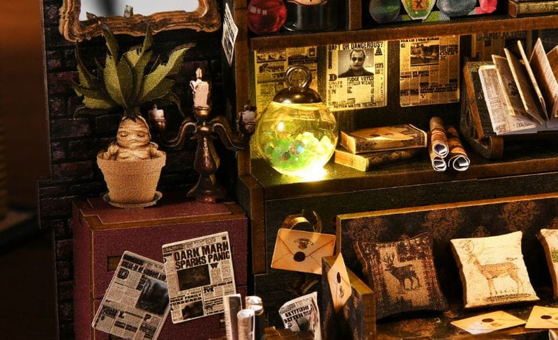 Elke plank, toverdrankfles en fantasierijke rekwisiet is nauwkeurig uit hout gesneden, waardoor de wonderbaarlijke wereld van een tovenaarsatelier in miniatuur wordt nagebootst.