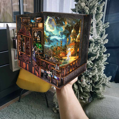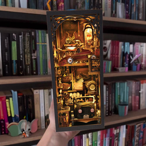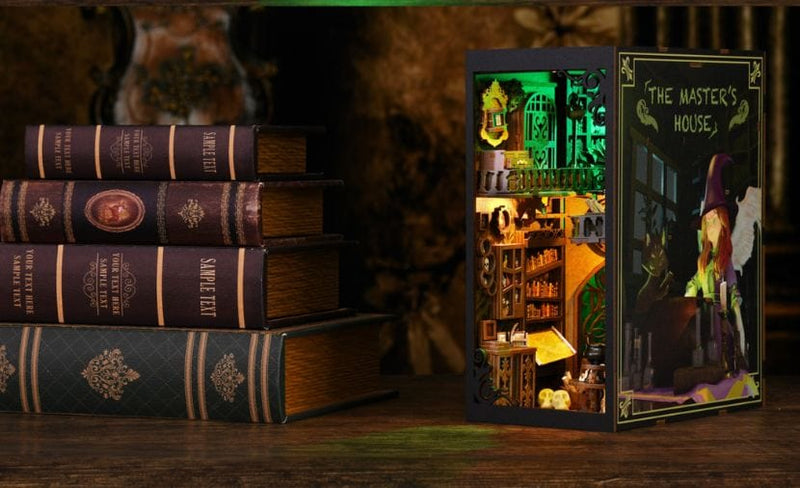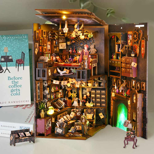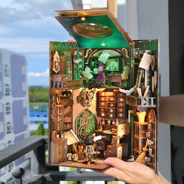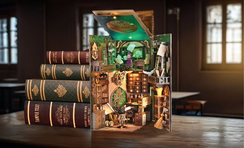 Deze boekenhoek, die eruitziet als een gebonden boek, verbergt een grillige alchemistenwereld binnenin - perfect als magisch middelpunt voor uw boekenplank of studeerkamer.