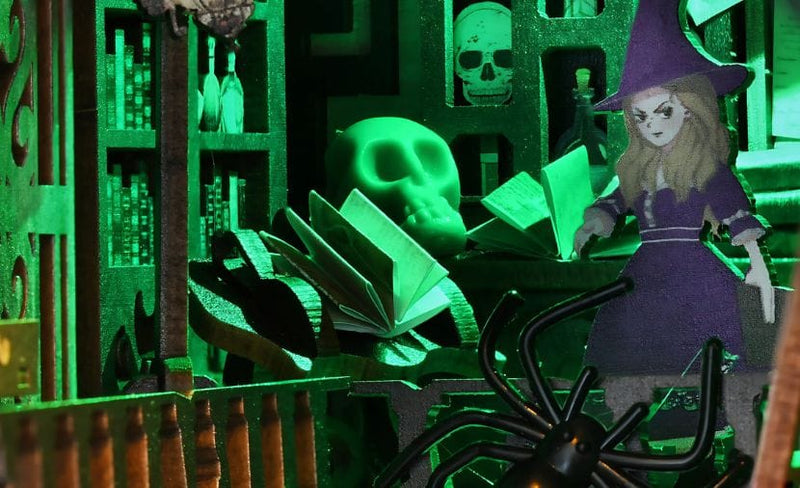 Ingebouwde ledverlichting baadt de kamer in een griezelige groene gloed, verlicht elke hoek en draagt bij aan de magische sfeer.