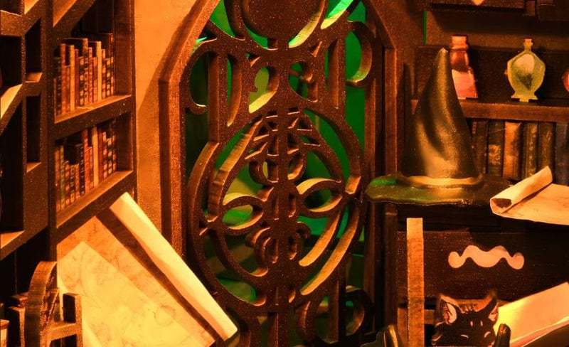 Elke gebeeldhouwde plank, toverdrankfles en betoverd symbool is vervaardigd uit nauwkeurig gesneden hout, waardoor de essentie van een mysterieuze alchemistenkamer wordt weergegeven.