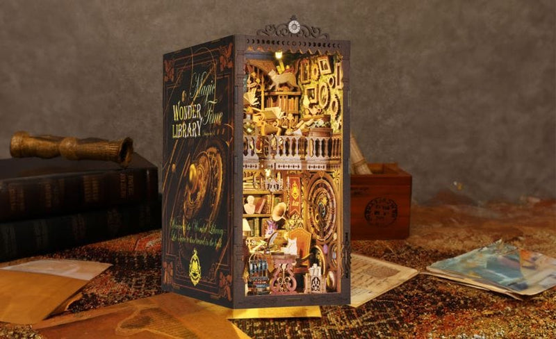 Wonder Library is vormgegeven als een klassieke hardcover en onthult bij het openen een verlichte bibliotheekscène – perfect om neer te zetten op een boekenplank, bureau of studeerkamer.