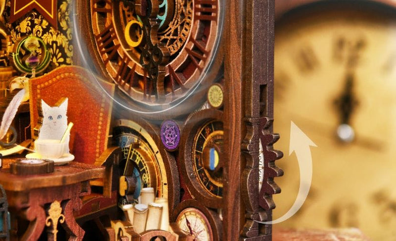 Van draaiende tandwielen en vintage stoelen tot miniatuurboeken en ornamenten: elk detail voegt diepte en realisme toe aan de scène.